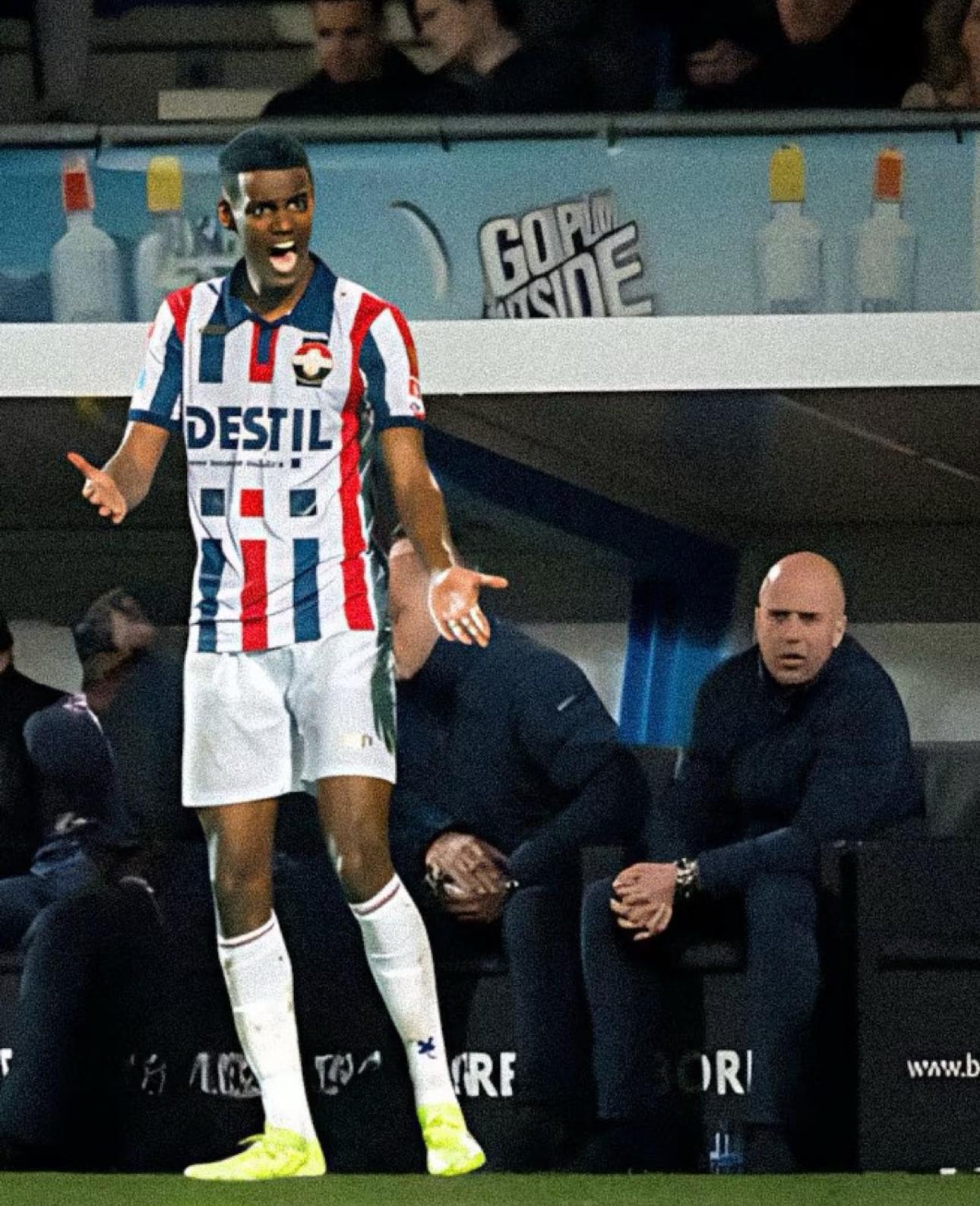 这张照片上的场景发生在2018/19赛季,当时年仅19岁的伊萨克被多特蒙德租借至荷甲球队威廉二世效力,而斯洛特则还在阿尔克马尔队担任助理教练,到下个赛季才升任主帅。
